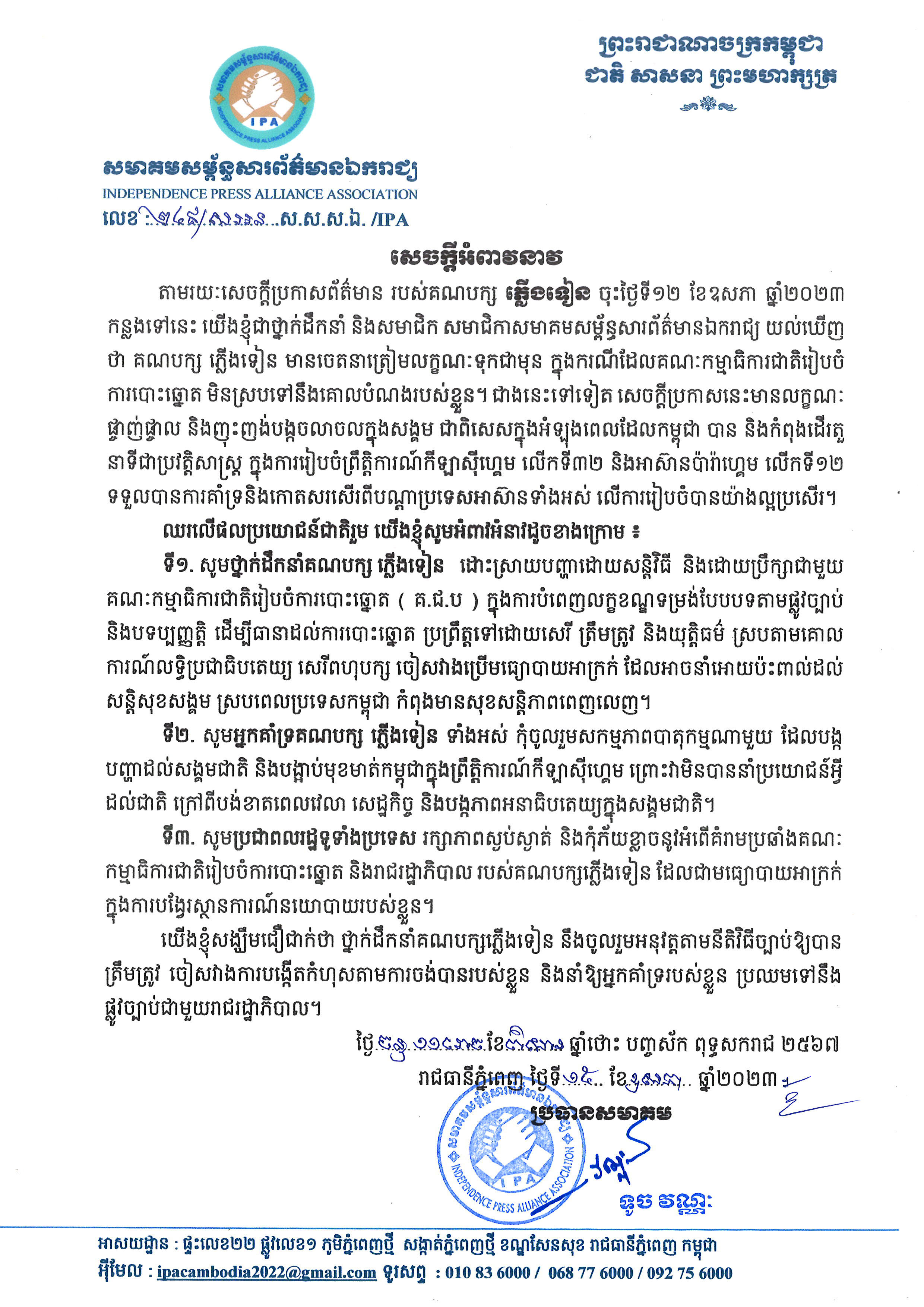 សមាគមសម្ព័ន្ធសារព័ត៌មានឯករាជ្យ អំពាវនាវ ៣ចំណុច ទៅកាន់គណបក្សភ្លើងទៀន និងប្រជាពលរដ្ឋ ចេញផ្សាយថ្ងៃចន្ទ ទី១៥ ខែឧសភា ឆ្នាំ២០២៣ ការិយាល័យនិពន្ធ 017778289=0882476167