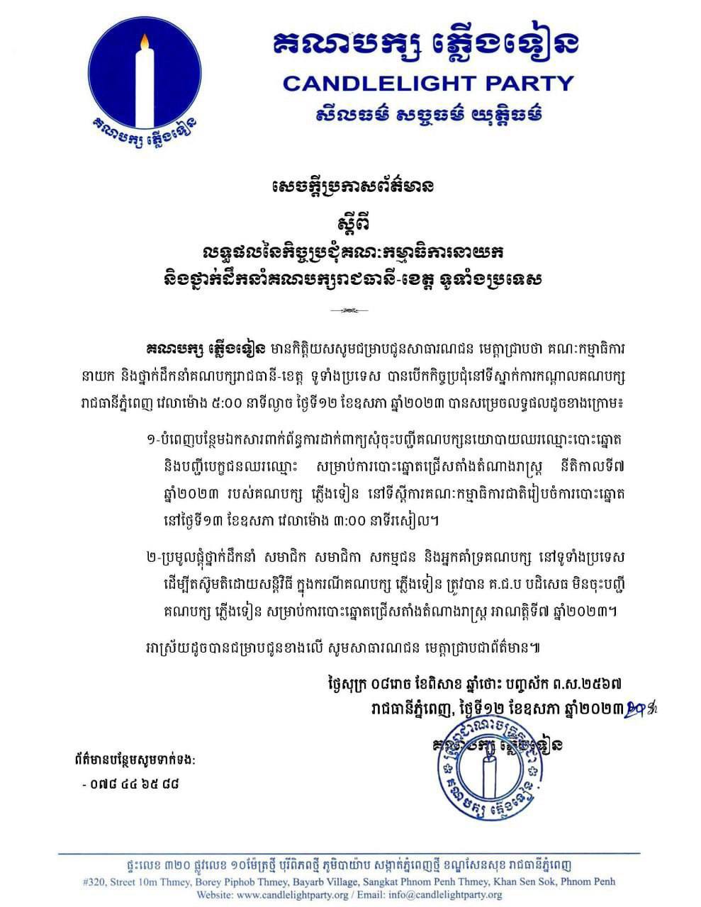 សូមបញ្ជាក់ជូនថា សេចក្តីប្រកាសព័ត៌មានរបស់គណបក្សភ្លើងទៀន ចុះថ្ងៃទី១២ ខែឧសភា ឆ្នាំ២០២៣ បានលើកឡើង ២ចំណុច ដែលចំណុចទី២ ថា ៖ ប្រមូលផ្តុំថ្នាក់ដឹកនាំ សមាជិក សមាជិកា សកម្មជន និងអ្នកគាំទ្រគណបក្ស នៅទូទាំងប្រទេស ដើម្បីតស៊ូមតិដោយសន្តិវិធី ក្នុងករណីគណបក្សភ្លើងទៀន ត្រូវបាន គ.ជ.ប បដិសេធមិនចុះបញ្ជីគណបក្សភ្លើងទៀន សម្រាប់ការបោះឆ្នោតជ្រើសតាំងតំណាងរាស្ត្រ អាណត្តិទី៧ ឆ្នាំ២០២៣៕