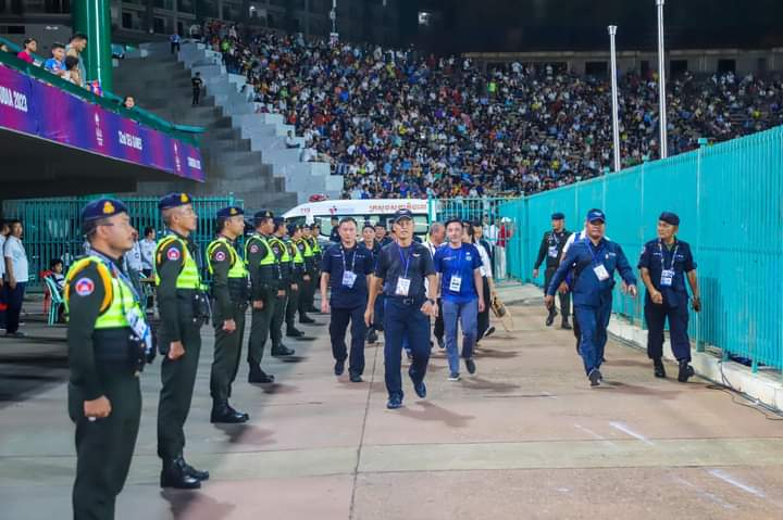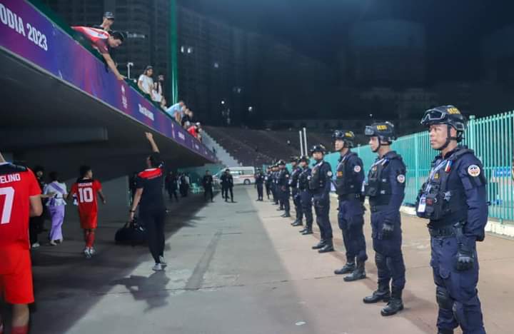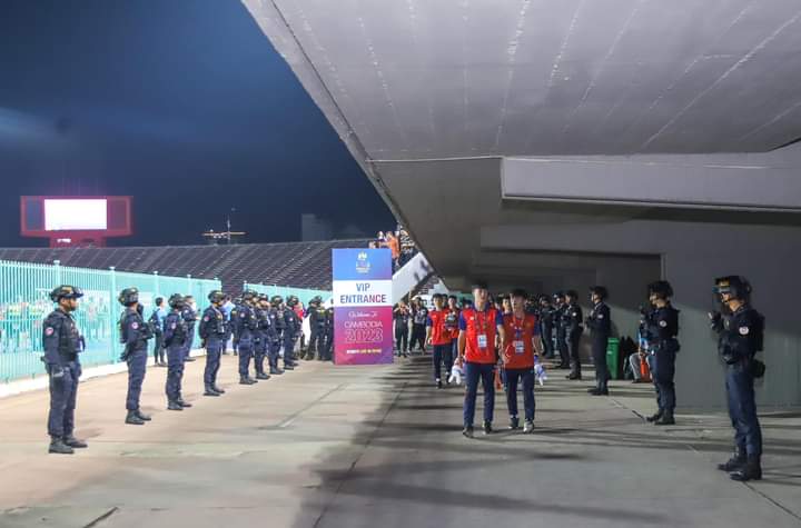 កម្លាំងអាវុធហត្ថរាជធានីភ្នំពេញ ចូលរួមការពារ សន្តិសុខ រក្សាសណ្តាប់ធ្នាប់ ក្នុងការប្រកួតបាល់ទាត់បុរស អាយុក្រោម ២២ឆ្នាំ វគ្គផ្តាច់ព្រ័ត្រ ដណ្តើមយកមេដាយមាស រវាងក្រុមជំរើសជាតិ ឥណ្ឌូណេស៊ី និង ថៃ នាយប់ ថ្ងៃទី១៦ ខែឧសភា ឆ្នាំ២០២៣។ ជាលទ្ធផលក្រុមជម្រើសជាតិ ឥណ្ឌូណេស៊ី យកឈ្នះ ក្រុមជម្រើសជាតិ ថៃ ក្នុងលទ្ធផល ៥ ទល់នឹង ២ ៕