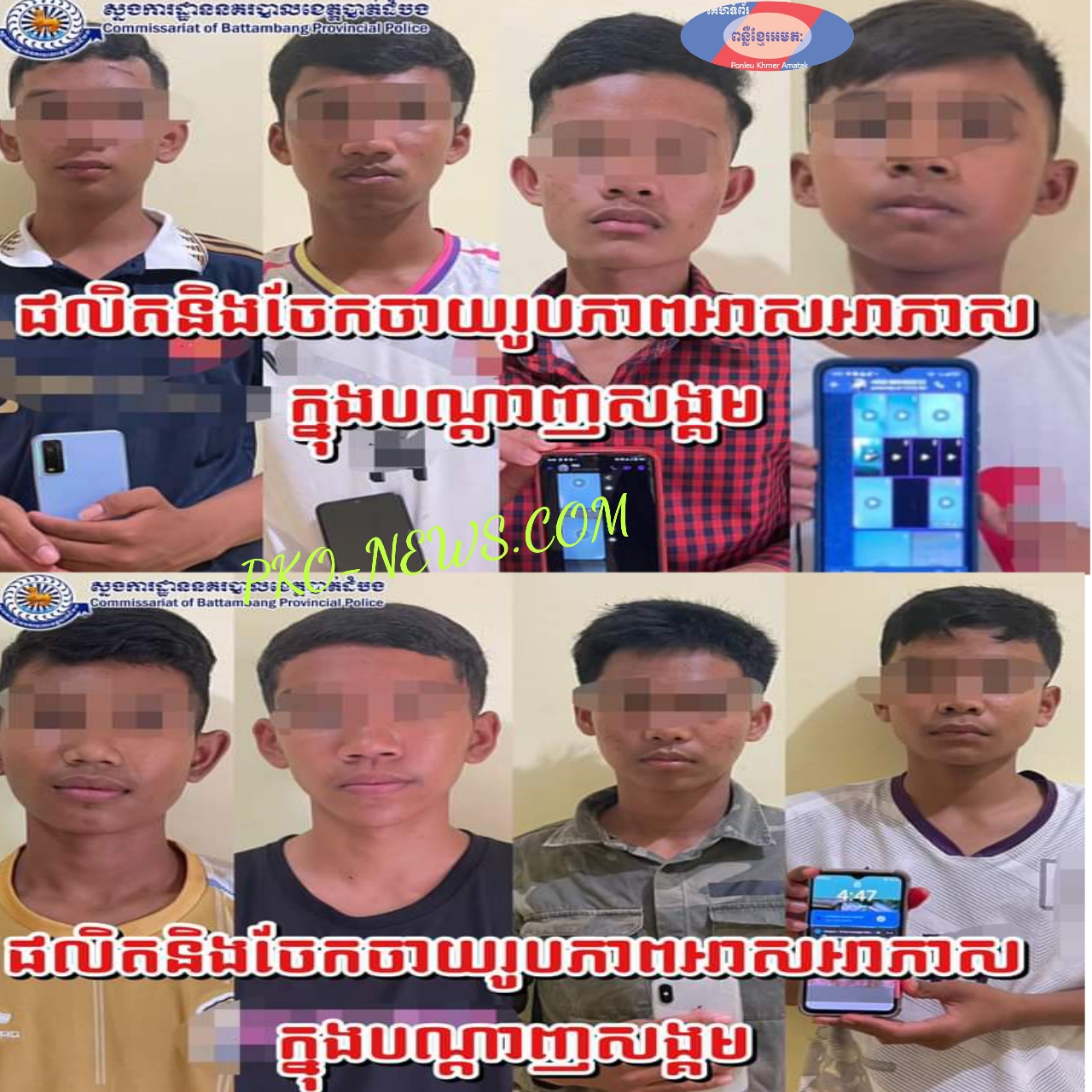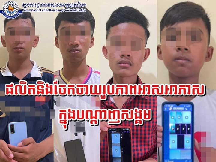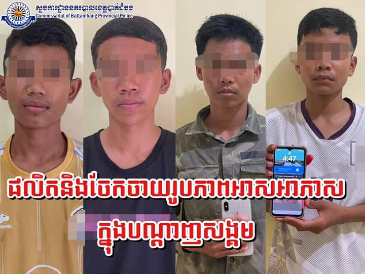 ខែត្តបាត់ដំបង ÷ កាលពីថ្ងៃអាទិត្យ ១២រោចខែទុតិយាសាឍឆ្នាំថោះបញ្ចស័កព.ស.២៥៦៧ ត្រូវនឹងថ្ងៃទី ១៣ ខែ សីហា ឆ្នាំ ២០២៣ វេលាម៉ោង ១៧និង៥០នាទី អនុវត្តតាមយោបល់ដឹកនាំបញ្ជារបស់លោកឧត្តមសេនីយ៍ទោ សាត គឹមសាន ស្នងការនៃស្នងការដ្ឋាននគរបាលខេត្តបាត់ដំបង និងលោកស្រីឧត្តមសេនីយ៍ត្រី រស់ ជីវី ស្នងការរងផែនការងារ ប្រឆាំងការជួញដូរមនុស្សនិងការពារអនីតិជន និងការងារយេនឌ័រនៃស្នងការដ្ឋាន និងដោយបានការសម្រប សម្រួលលើនីតិវិធីពីឯកឧត្តម កែវ សុជាតិ ព្រះរាជអាជ្ញានៃអយ្យការអមសាលាដំបូងខេត្តបាត់ដំបងផងនោះ លោក វរសេនីយ៍ទោ ហេង បារាំង អធិការនគរបាលស្រុកភ្នំព្រឹក បានដឹកនាំកម្លាំងធ្វើការស្រាវជ្រាវនិងឃាត់ខ្លួន ក្រុមយុវជនមួយក្រុមមានគ្នាចំនួន ០៨នាក់ ពាក់ព័ន្ធក្នុងករណីផលិតរូបភាពអាសអាភាស(លួចថតរូបជនរង គ្រោះ)និងចែកចាយរូបភាពនេះជាសាធារណៈក្នុងបណ្តាញសង្គម។