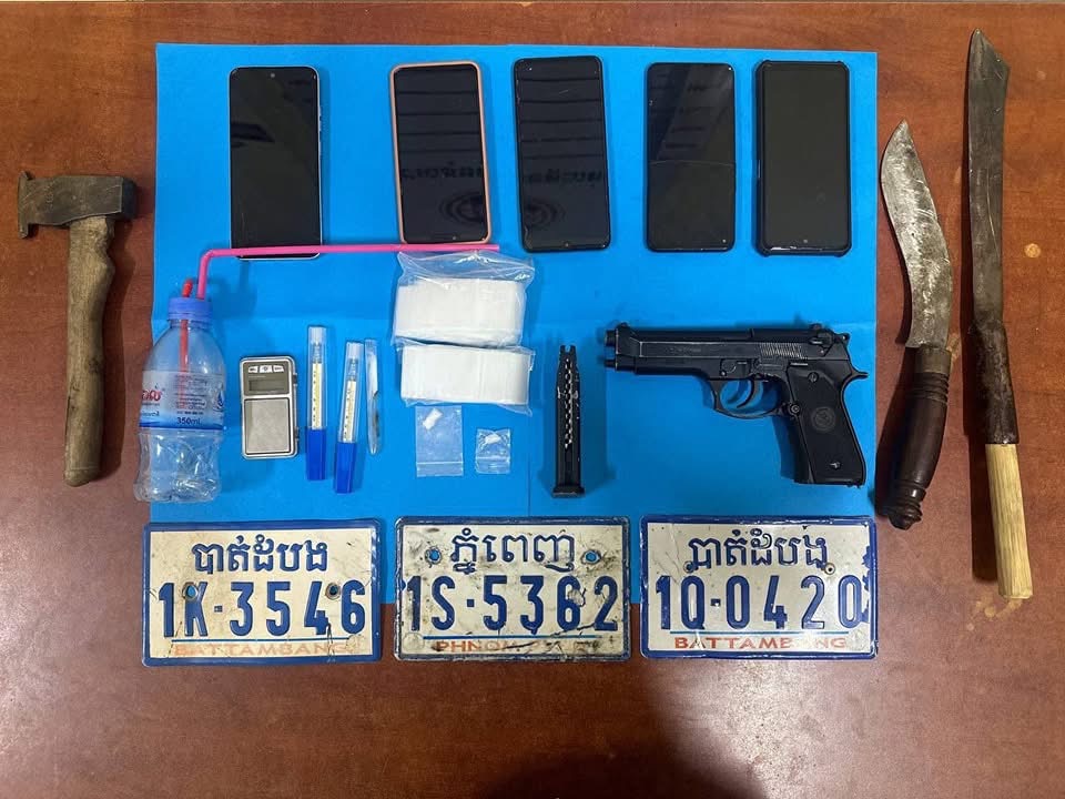 វត្ថុតាងដកហូតបានរួមមាន ៖ គ្រឿងញៀនប្រភេទម្សៅក្រាមពណ៌សថ្លា( ice ) ចំនួន០២កញ្ចប់ ទម្ងន់ ១.០៧ ក្រាម ( ថ្លឹងទាំងសំបក ) ទូរស័ព្ទ ចំនួន០៥គ្រឿង .កាំភ្លើងហ្គាស ចំនួន០១ដើម.ពូថៅ ចំនួន ០១ដើម.កាំបិត ចំនួន ០២ដើម.ទែម៉ូម៉ែត ចំនួន០២ .ផ្លាកលេខម៉ូតូចំនួន០៣.ជញ្ជឹងសម្រាប់ថ្លឹងគ្រឿងញៀន ចំនួន ០១.ម៉ាស៊ីនបូមទឹក ០១គ្រឿង.ម៉ាស៊ីនគោយន្ត ០១គ្រឿង.ម៉ូទ័របូមទឹក០១គ្រឿង.អាគុយ ០៦គ្រឿង