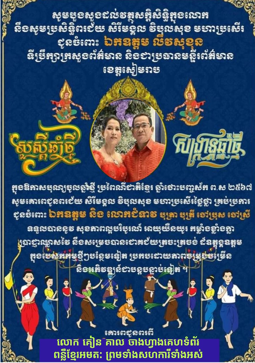 ក្នុងឱកាសបុណ្យចូលឆ្នាំថ្មី ប្រពៃណីជាតិខ្មែរ ឆ្នាំថោះ បញ្ចស័ក ព.ស.២៥៦៧ គ.ស.២០២៣ សូមទេវតាឆ្នាំថ្មី និងវត្ថុស័ក្តសិទ្ធិ ក្នុងលោក ប្រោះប្រទានពរជ័យ សិរីមង្គល បវរមហាប្រសើរ ជូន ឯកឧត្តម លីវសុខុន ទីប្រឹក្សាក្រសួងព័ត៌មាន និងជាប្រធានមន្ទីរព័ត៌មានខេត្តសៀមរាប និងលោក ជំទាវ ព្រមទាំងបុត្រត្រា បុត្រត្រី អនុញ្ញាតិសូមជូនពរពីរ លោក គៀន គាល ចាងហ្វាង គេហទំព័រ ពន្លឺខ្មែរអមត: ព្រមទាំងសហការីទាំងអស់ ចេញផ្សាយថ្ងៃពុធ ទី១២ ខែមេសា ឆ្នាំ២០២៣ ការិយាល័យនិពន្ធ 017778289=0882476167