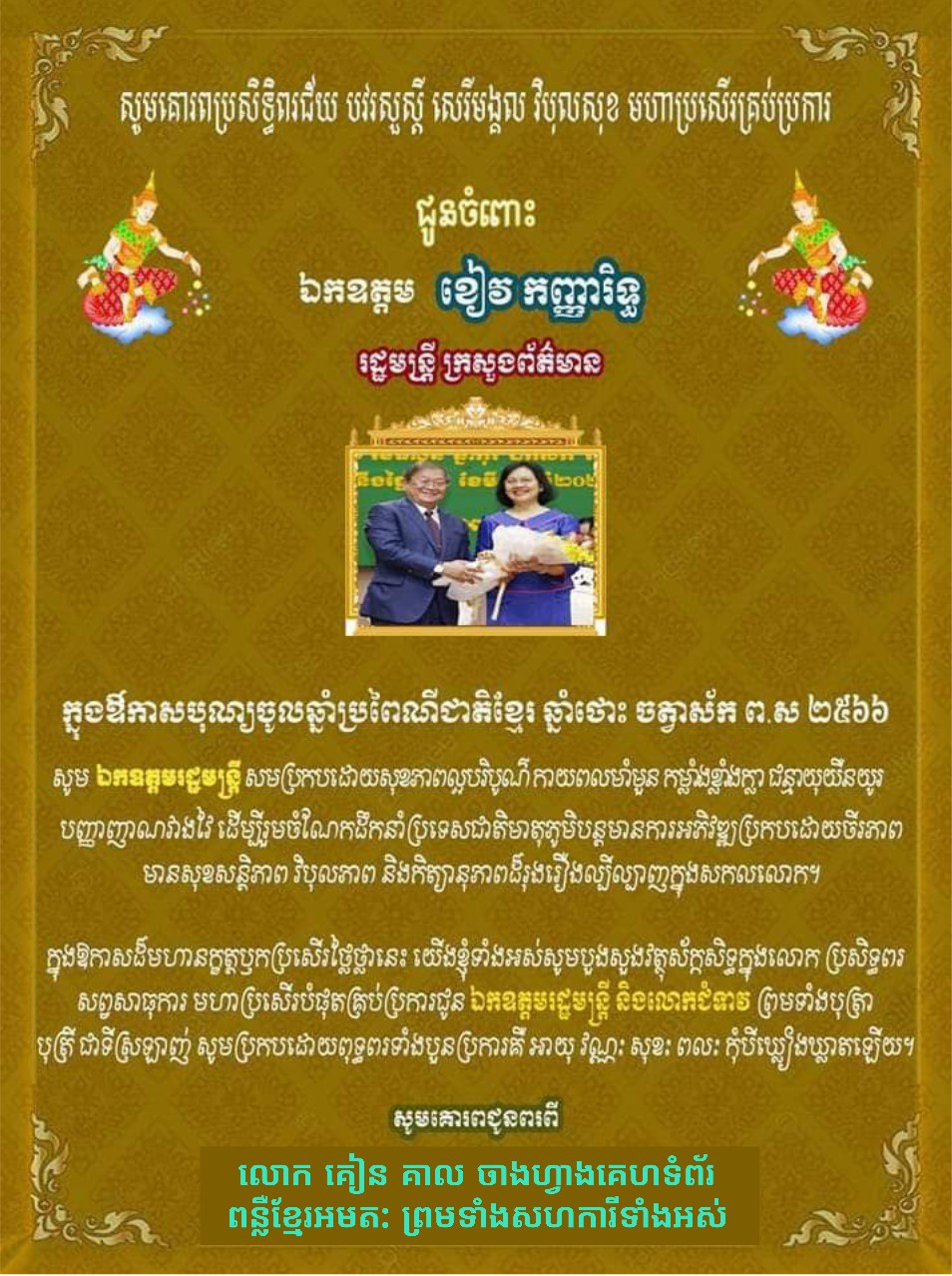 ក្នុងឱកាសបុណ្យចូលឆ្នាំថ្មី ប្រពៃណីជាតិខ្មែរ ឆ្នាំថោះ បញ្ចស័ក ព.ស.២៥៦៧ គ.ស.២០២៣ សូមទេវតាឆ្នាំថ្មី និងវត្ថុស័ក្តសិទ្ធិ ក្នុងលោក ប្រោះប្រទានពរជ័យ សិរីមង្គល បវរមហាប្រសើរ ជូន ឯកឧត្តម ខៀវ កញ្ញារិទ្ធ រដ្ឋមន្ត្រីក្រសួងព័ត៌មាន