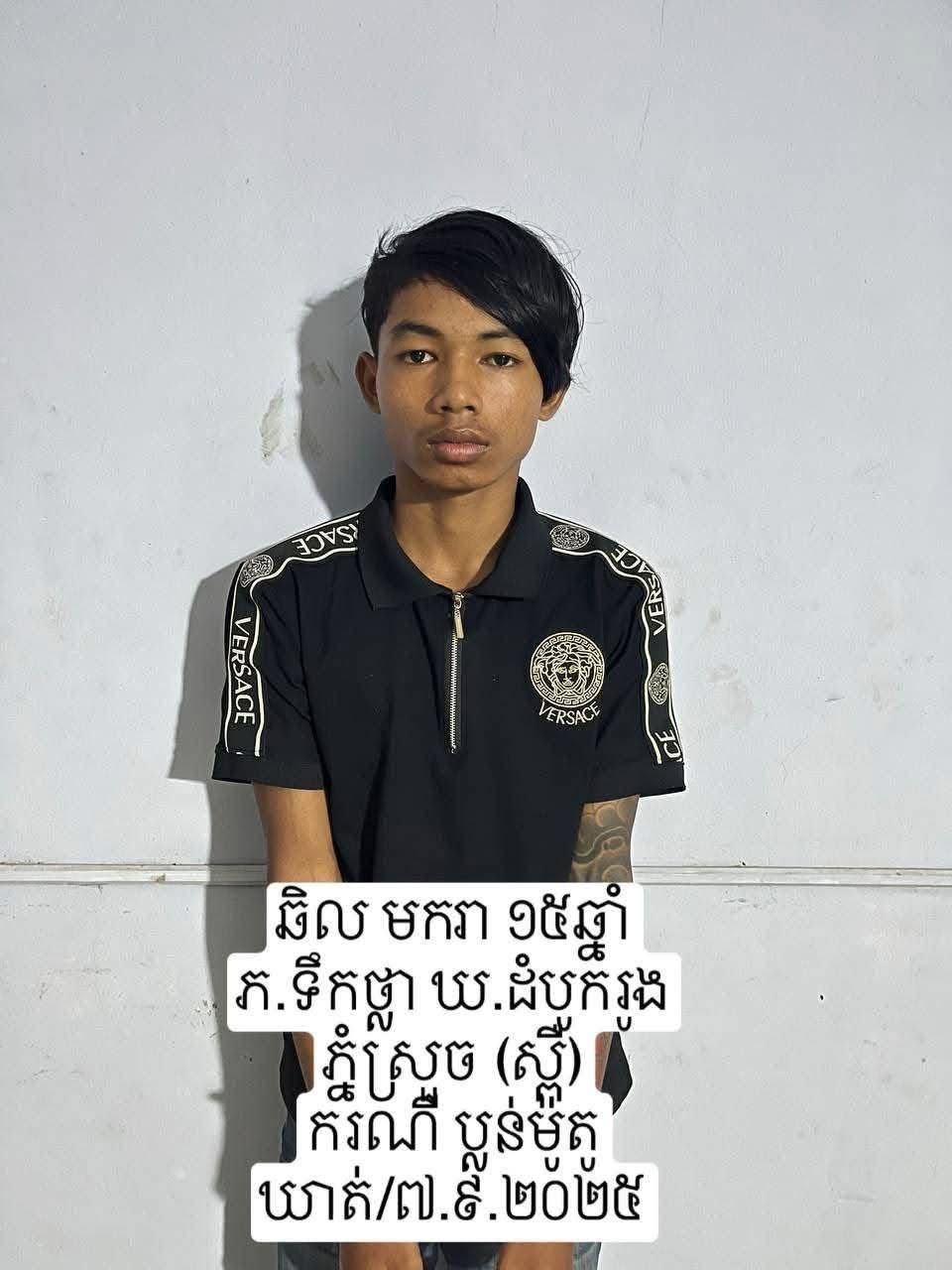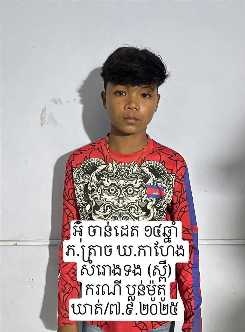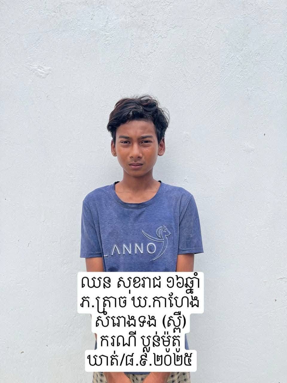 ថ្ងៃទី០៨ ខែកញ្ញា ឆ្នាំ២០២៥ កម្លាំងសមត្ថកិច្ចបន្តឃាត់ខ្លួនបានឈ្មោះ ឈន សុខរាជ ភេទប្រុស អាយុ ១៦ឆ្នាំ នៅភូមិត្រាច ឃុំកាហែងស្រុកសំរោងទង ខេត្តកំពង់ស្ពឺ ដែលជាបក្សពួក។