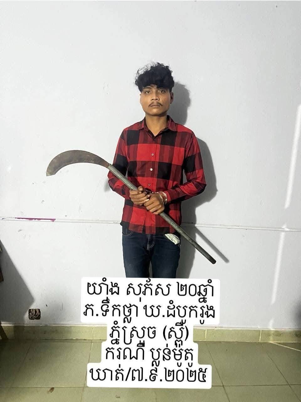 ខេត្តកំពង់ស្ពឺ៖ សមត្ថកិច្ចខេត្តកំពង់ស្ពឺបើកប្រតិបត្តិការដ៍ក្តៅគគុកកាលពីថ្ងៃទី០៧ ខែកញ្ញា ឆ្នាំ២០២៥ ដោយបានអនុវត្តតាមបទបញ្ជាដ៏ខ្ពង់ខ្ពស់របស់លោក ឧត្តមសេនីយ៌ទោ ឃឹម សុកខៃ ស្នងការនគរបាលខេត្ត នឹងដឹកនាំបញ្ជាផ្ទាល់ពីលោក ឧត្តមសេនីយ៌ ត្រី សមសាក់ ស្នងការរងទទួលផែន ព្រហ្មទណ្ឌ័។ នៅម៉ោង២០និង១៥នាទីសមត្ថកិច្ចបានទទួលព័ត៌មានពីឈ្មោះ សាត រស់ ប្រុស ២៣ឆ្នាំនៅភូមិពង្រ ឃុំតាំងក្រូច ស្រុកសំរោងទង ខេត្តកំពង់ស្ពឺ។ ថាមានជនល្មើសចំនួន៥នាក់ជិះម៉ូតូ២គ្រឿងបានស្ទាក់ប្លន់យកម៉ូតូរបស់ខ្លួន ម៉ាកហុងដាសេ១២៥ពណ៌សេរីឆ្នាំ២០១៩ ស្លាកលេខ.កណ្ដាល 1AE.7272 ពេលដែលខ្លួនជិះពីលិចទៅកើតតាមផ្លូវជាតិលេខ៤មកដល់គីឡូម៉ែត្រ ៥៦/៥៧ចំណុចភូមិពង្រធំ ឃុំកាហែង ស្រុកសំរោងទង ខេត្តកំពង់ស្ពឺ។
