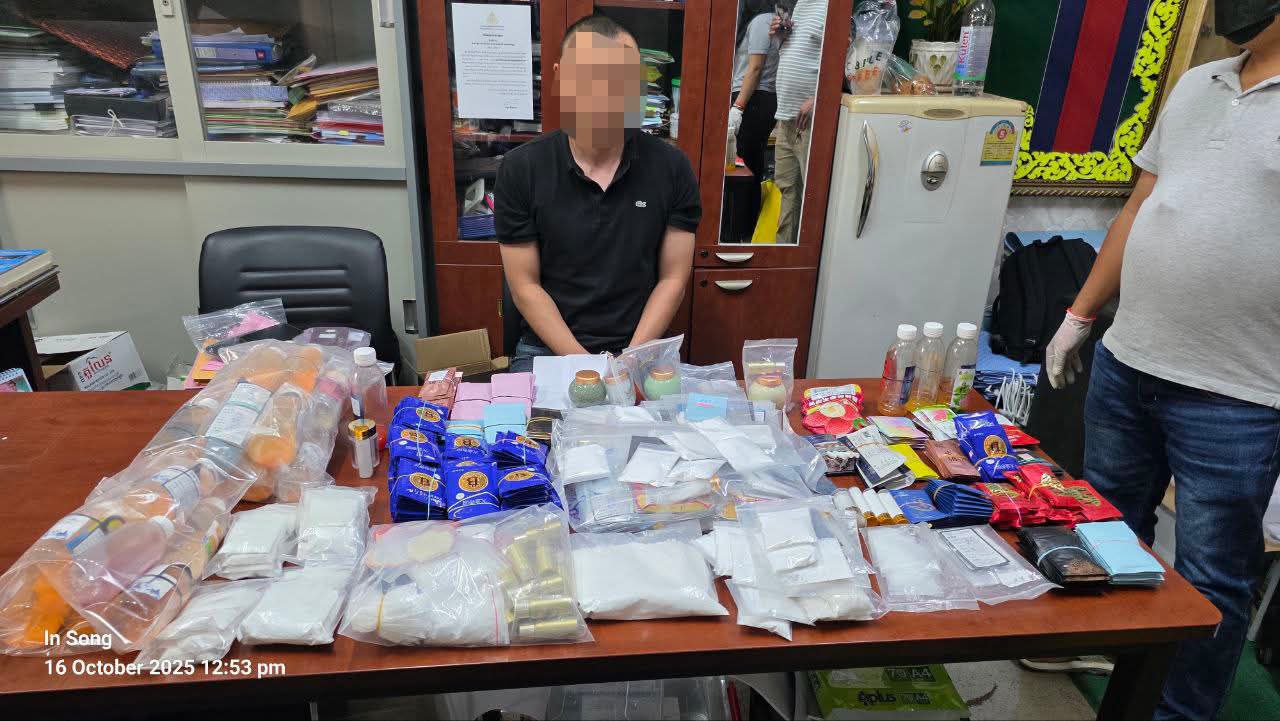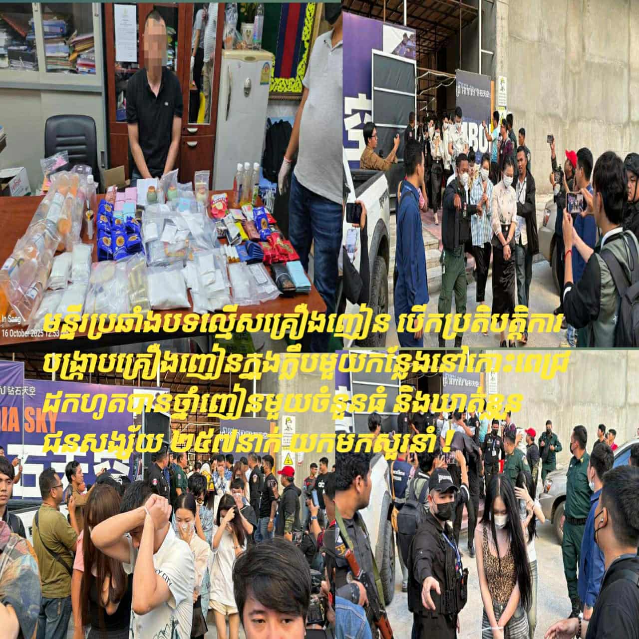 រាជធានីភ្នំពេញ៖ អនុវត្តតាមបទបញ្ជារបស់ ឯកឧត្តម នាយឧត្តមសេនីយ៍ ស ថេត អគ្គស្នងការនគរបាលជាតិ និង ឯកឧត្តមឧត្តមសេនីយ៍ឯក ប៊ុន ប៉ាម៉ារីលុច អគ្គស្នងការរងទទួលដឹកនាំ មន្ទីរប្រឆាំងបទល្មើសគ្រឿងញៀន និង ឯកឧត្តម ឧត្តមសេនីយ៍ឯក ព្រុំសន្ធរ អគ្គស្នងការរងទទួលសហការដឹកនាំមន្ទីរប្រឆាំងគ្រឿនញៀន និងដឹកនាំបញ្ជាផ្ទាល់ពីឯកឧត្តម ឧត្តមសេនីយ៍ឯក ឃឹង សារ៉ាត់នាយកមន្ទីរប្រឆាំងបទល្មើសគ្រឿងញៀន នៅម៉ោង១២ និង៣០នាទីយប់រំលងអាធ្រាត្រ ឈានចូលថ្ងៃទី១៦ ខែតុលា ឆ្នាំ២០២៥កម្លាំងនៃមន្ទីរប្រឆាំងបទល្មើសគ្រឿងញៀន បានសហការជាមួយស្នងការដ្ឋានរាជធានីភ្នំពេញ ដោយមានការដឹកនាំសម្របសម្រួលពីព្រះរាជអាជ្ញារង នៃអយ្យការអមសាលាដំបូងរាជធានីភ្នំពេញ លោក គឹម ហុងសាន បានឆ្មក់ចូលបង្ក្រាបករណីរក្សារទុក ជួញដូរចាត់ចែងសម្រួលឱ្យប្រើប្រាស់ និងប្រើប្រាស់នូវសារធាតុញៀន នៅក្លឹបមួយកន្លែងឈ្មោះ ខេមបូឌា ស្កាយ៍ Cambodia Sky ឋិតនៅចំណុចកោះពេជ្រ សង្កាត់ទន្លេបាសាក់ ខណ្ឌចំការមន រាជធានីភ្នំពេញ។